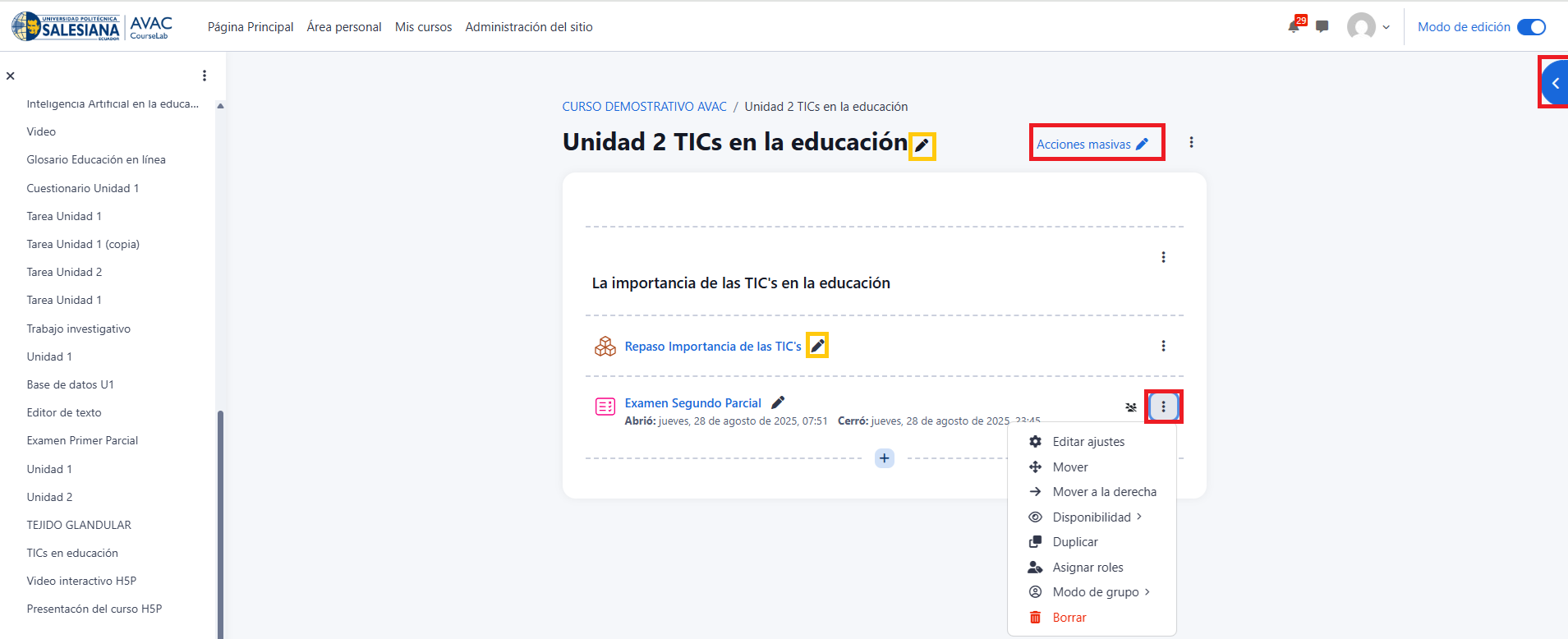 Al pulsar la opción Acciones masivas, el docente puede realizar acciones sobre recursos, actividades y secciones que se encuentre creadas de forma manual por el docente. Permite realizar acciones de forma simultánea en vez de hacerlo uno a uno.