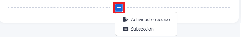 Al final de cada una de las secciones, aparece el símbolo más que permite la creación de actividades y recursos desde el selector de actividades y las subsecciones. Dentro de cada subsección aparece el enlace Añadir una actividad o un recurso para incluir las actividades y contenidos.