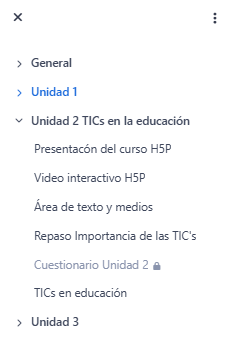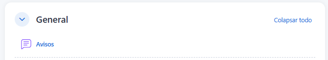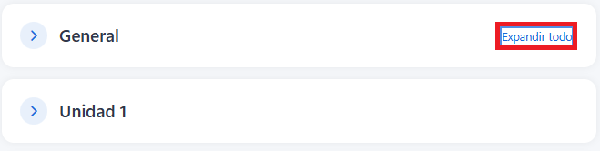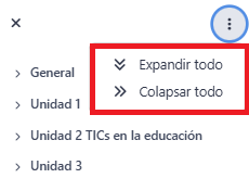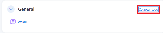 Se localizan los recursos y actividades del curso. Siempre hay una sección inicial y debajo pueden aparecer más. Pulsando sobre las secciones o subsecciones redirige a una página donde se muestra sólo el contenido de esa sección o subsección.