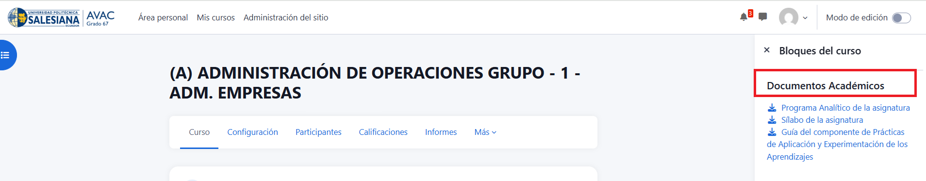 Para visualizar el "Bloque documentos académicos", debes hacer clic en la opción "Abrir cajón de bloques", localizado abajo de la opción "Modo de edición".