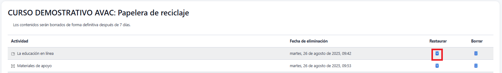 La papelera de reciclaje, se activa, cuando hemos eliminado algún recurso o actividad del curso. Permite a los profesores recuperar elementos del curso que hayan sido eliminados accidentalmente. Almacena temporalmente los elementos borrados y los elimina permanentemente después de un período de tiempo de siete días. Para recuperar la actividad o recurso eliminado, debe hacer clic en la opción Restaurar.