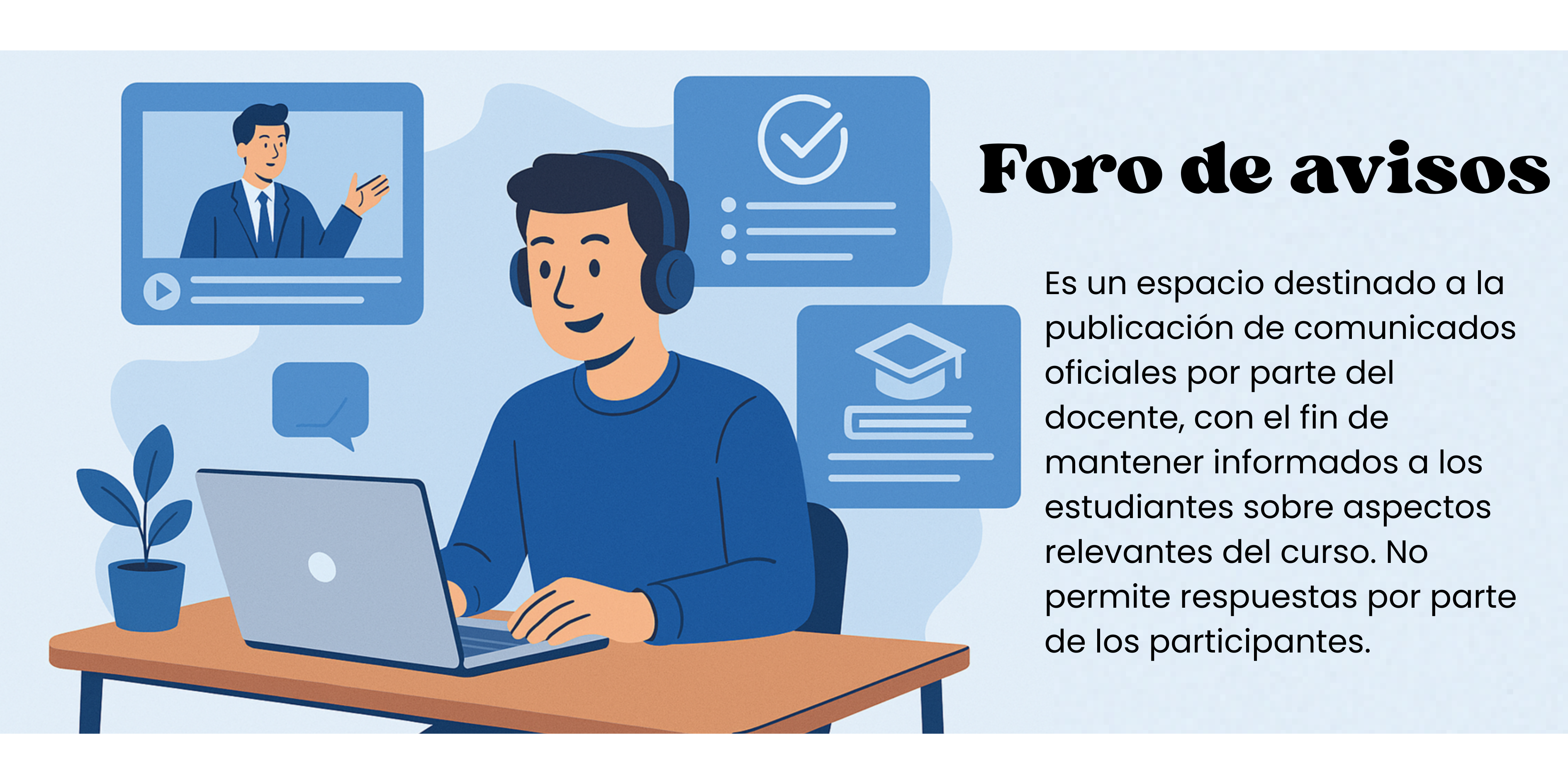 El Foro de Avisos es un espacio de comunicación unidireccional en el AVAC, creado automáticamente en cada curso. Sirve para que el docente publique anuncios, recordatorios y comunicados importantes a los estudiantes.