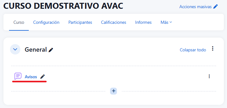 Espacio de tipo tablón de anuncios, diseñado exclusivamente para que el docente envíe notificaciones e información relevante de la asignatura a los estudiantes.