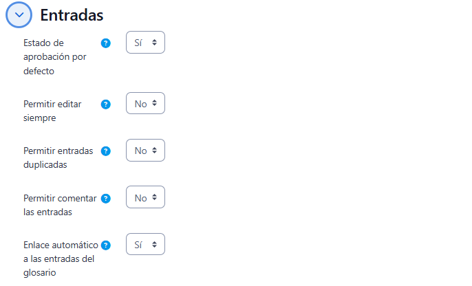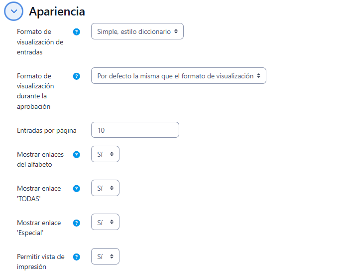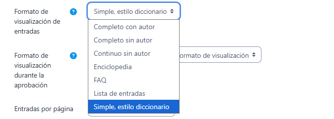 - "Formato de visualización de entradas" y "Formato de visualización durante la aprobación" definen la manera en la que se muestra cada entrada dentro del glosario, en la pantalla inicial y en la pantalla de aprobación para el profesor, respectivamente. Las opciones son: