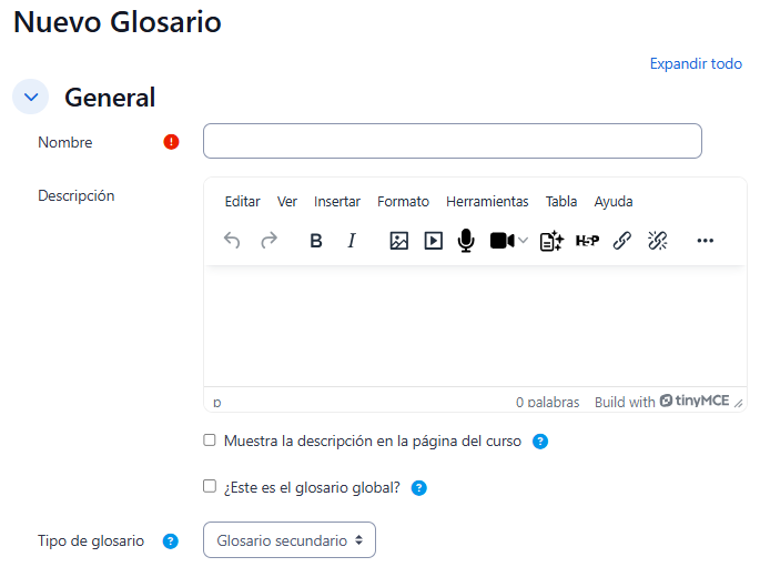- Secundario: Se utiliza cuando se desea crear un único glosario o varios glosarios específicos, por ejemplo, uno por cada tema.