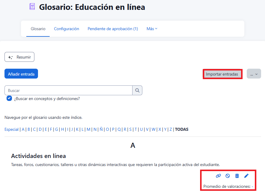 - Asimismo, es posible Importar o Exportar entradas del glosario mediante archivos y visualizar la versión para impresión. El profesor también puede editar y modificar tanto el texto como los archivos adjuntos proporcionados por el estudiante, asignar calificaciones o eliminar las entradas si es necesario.