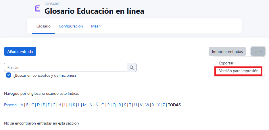 - "Mostrar enlace 'Especial'". En caso de estar activado se puede buscar en el glosario por caracteres especiales (ej. @, €, #, etc.).