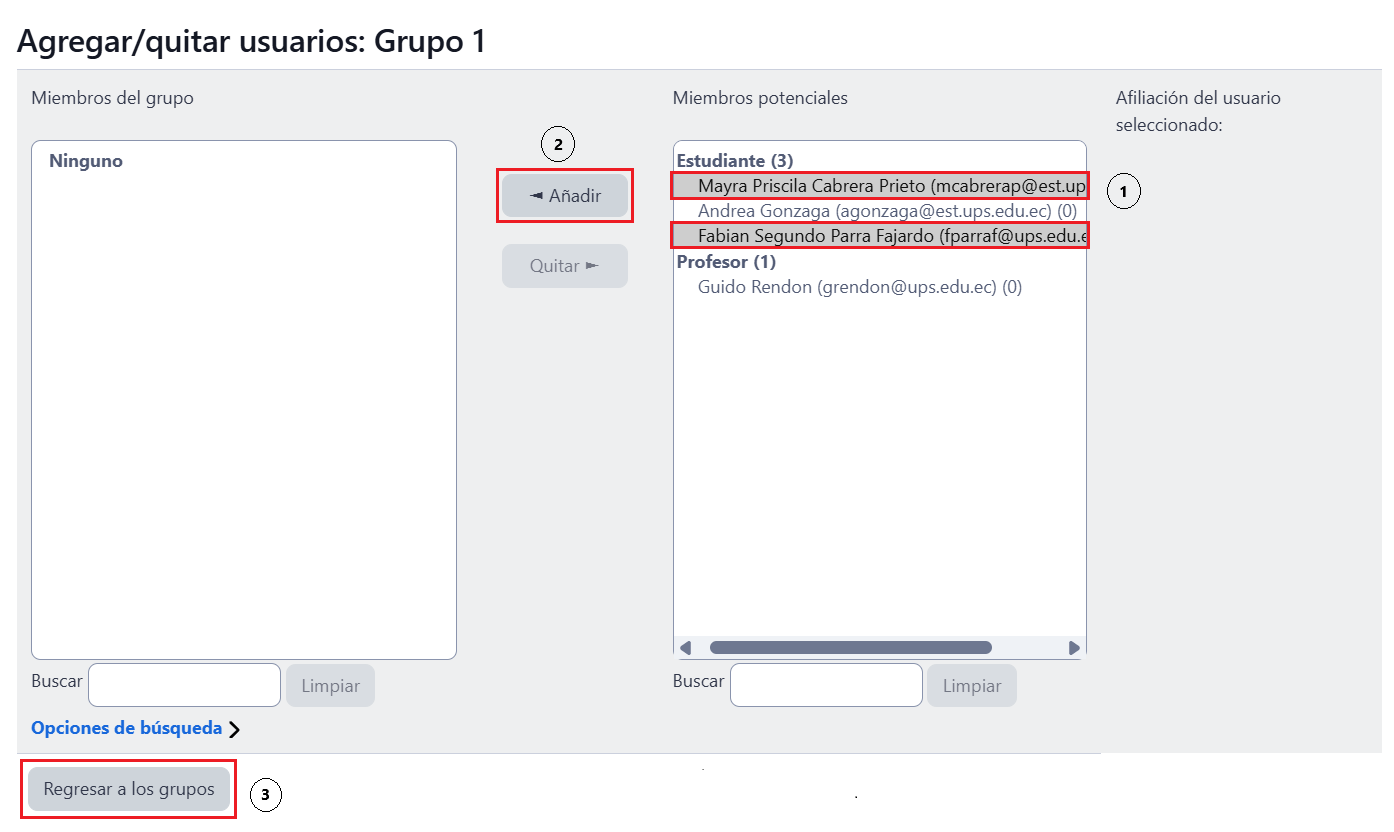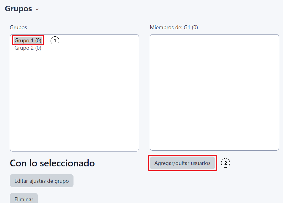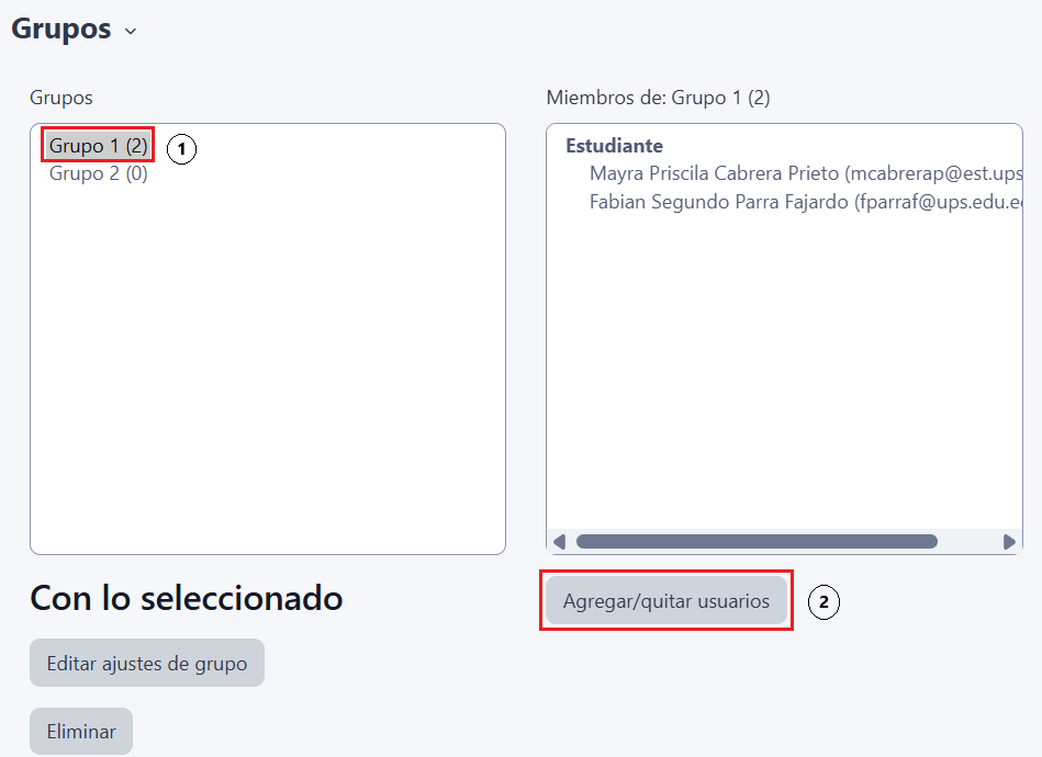 - Para asignar estudiantes debe seleccionar el grupo (1) y pulse en Agregar/quitar usuarios (2)".
