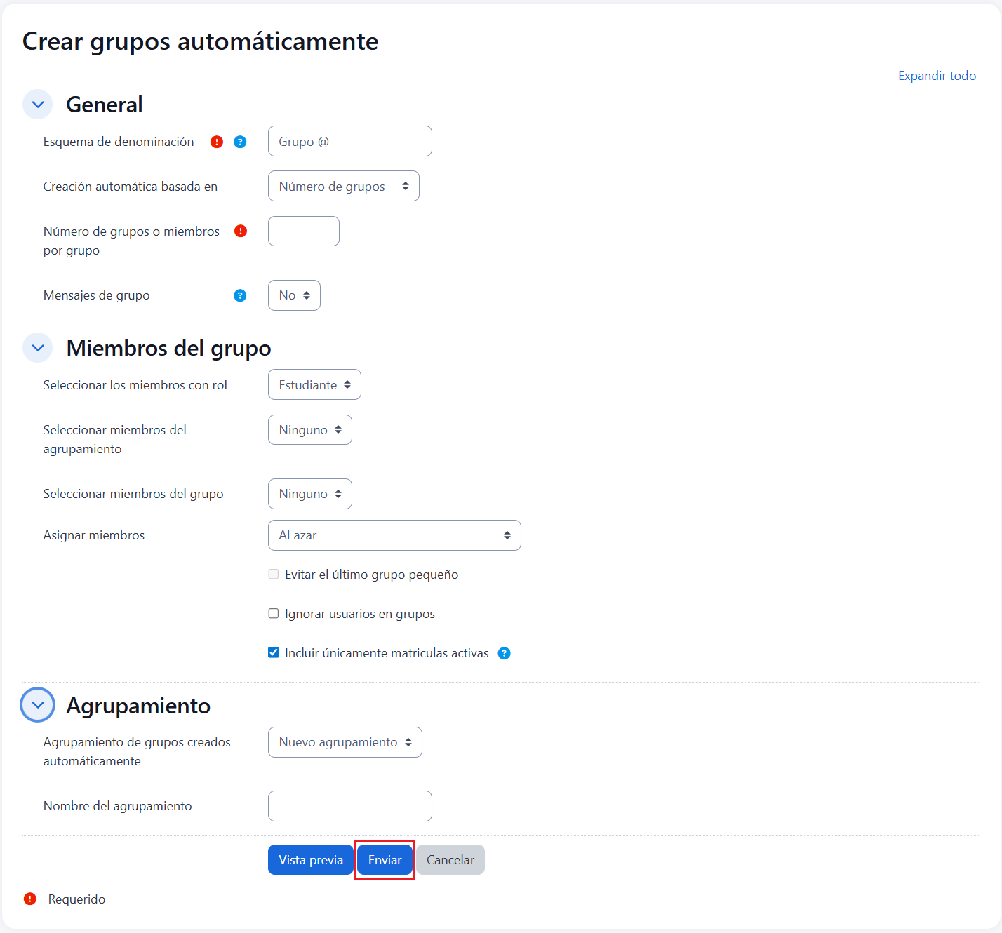 - Número de grupos o miembros por grupo (obligatorio): Especificar el número de grupos que se deben crear o el número que debe haber por grupo.