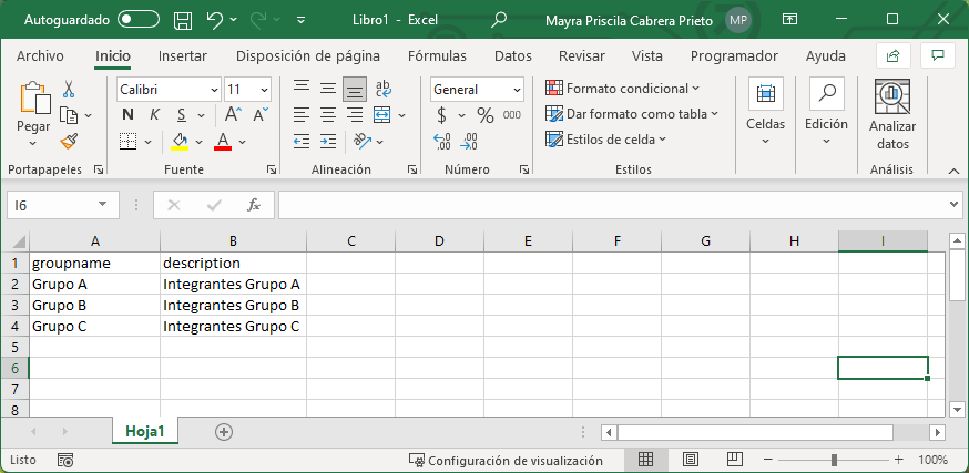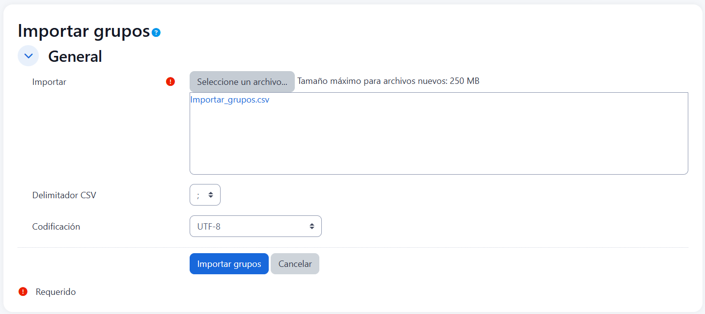 Permite importar grupos creados en una hoja de cálculo de Excel que fueron guardados en formato CSV y con codificación UTF-8. Esta acción crea los grupos vacíos.