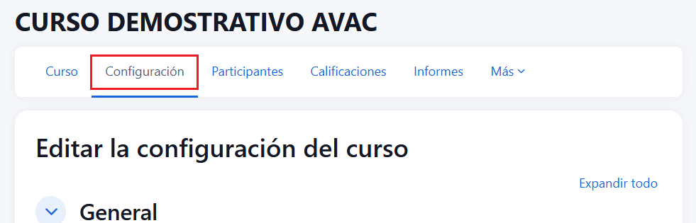 - Dar clic en la pestaña de Configuración del menú del curso.