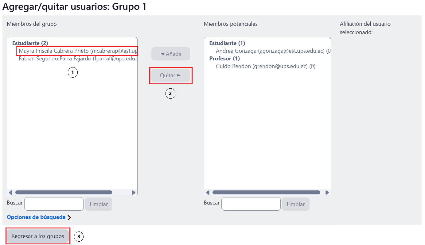 - Para eliminar estudiantes debe seleccionar el grupo (1) y pulse en Agregar/quitar usuarios (2)".
