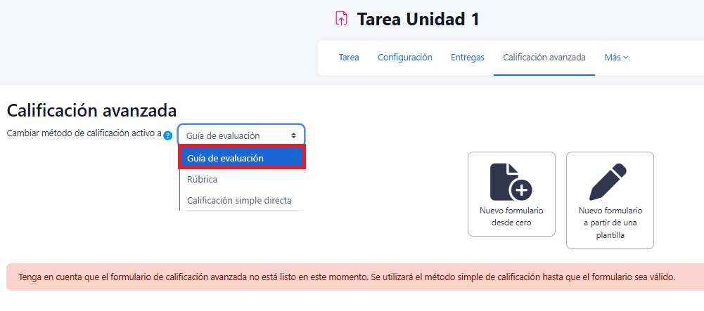 En el listado que se muestran en "Cambiar método de calificación activo a" , se procederá a escoger Guía de evaluación.