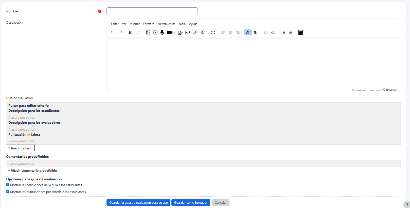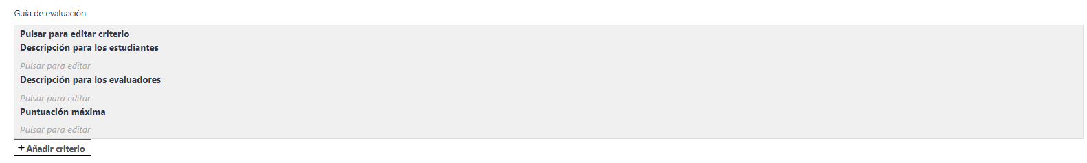 Para ingresar los criterios que son mostrados tanto al evaluador como a los estudiantes, pulse en la sección Pulsar para editar criterio, Descripción para los estudiantes y Descripción para los evaluadores , así como en Puntuación máxima para mostrar las puntuaciones por criterio a los estudiantes.