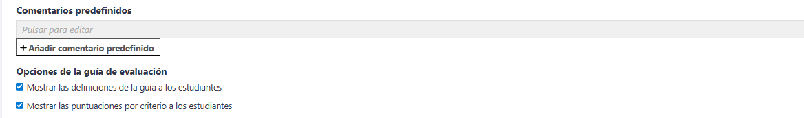 Se pueden Mostrar las definiciones de la guía a los estudiantes durante la evaluación o Mostrar las puntuaciones por criterio a los estudiantes.