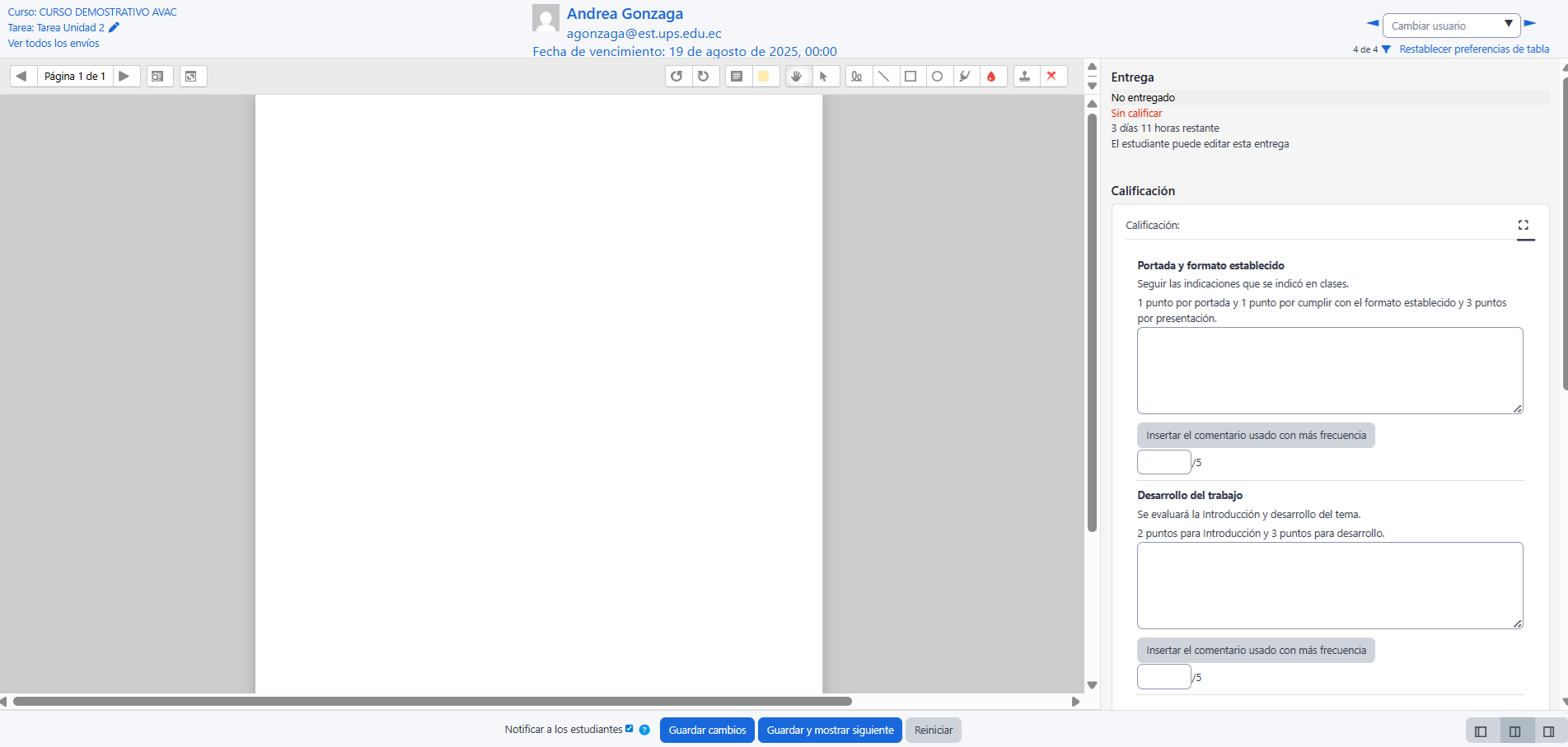 Se muestran los diferentes criterios de calificación y sus puntuaciones. Se puntúan los aspectos de la tarea en sus respectivas casillas sobre el valor máximo otorgado a los mismos.