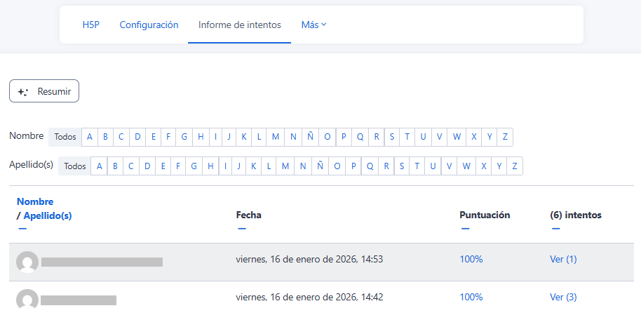 - Verifique que la actividad H5P aparece listada en el Libro de calificaciones con las notas de cada estudiante.