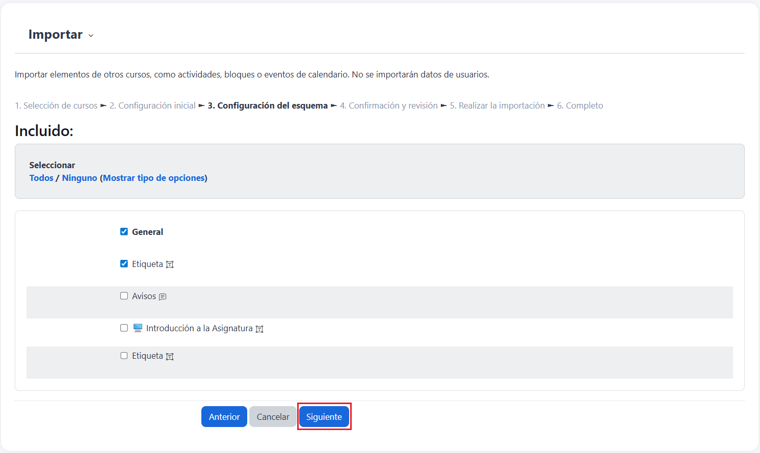 - Dentro de Configuración del esquema, se muestran todos los recursos y actividades del curso origen. Seleccione los elementos que desee importar y de clic en Siguiente.