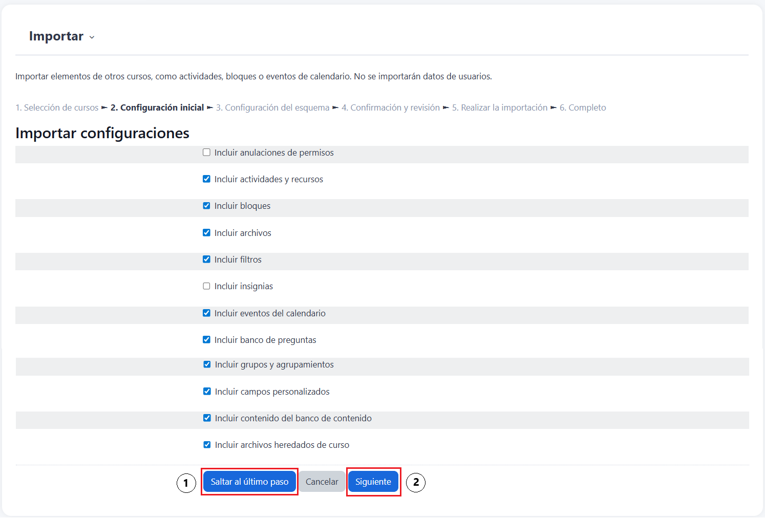 - En Configuración inicial puede importar todo el curso dando clic en Saltar al último paso (1), o para realizar una importación personalizada debe pulsar en Siguiente (2).