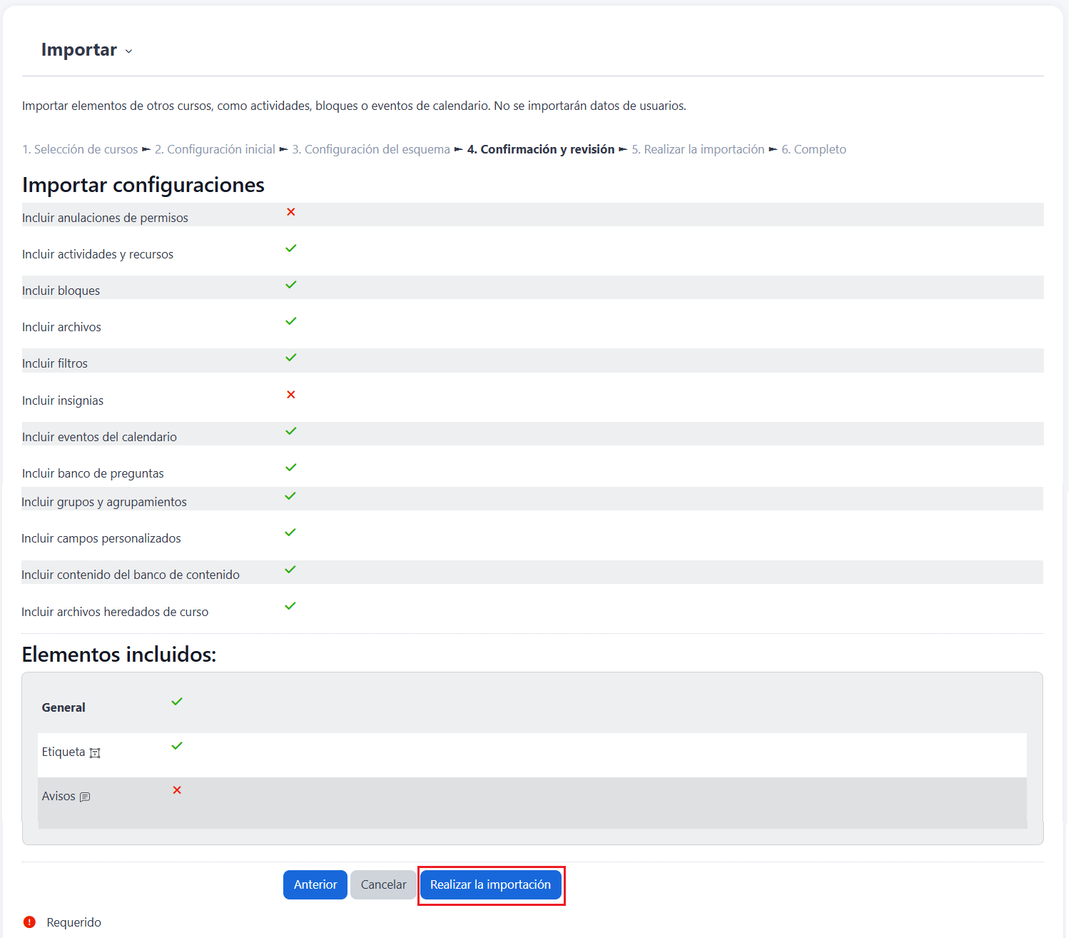 - En Confirmación y revisión, comprobar si es el contenido que se desea importar y dar clic en Realizar la importación.