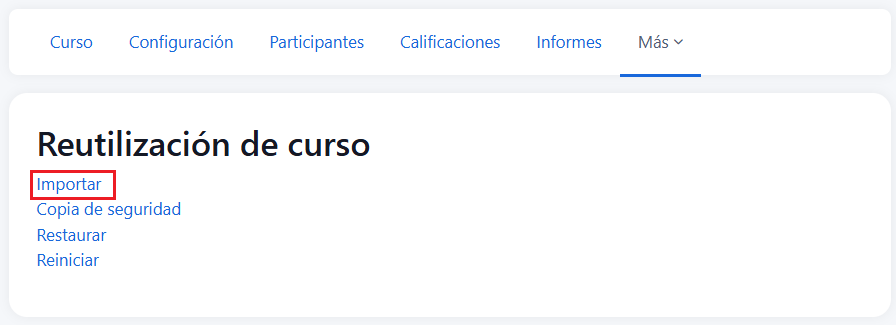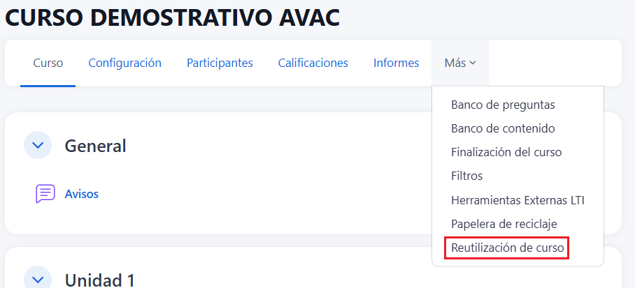 - En la página del curso, dar clic en el menú Más y seleccionar Reutilización de curso