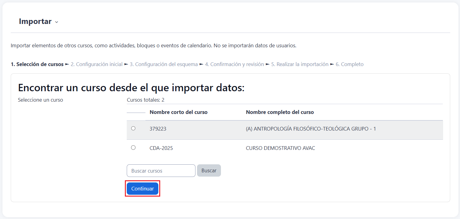 - En Selección de cursos debe seleccionar el curso origen, desde el que se va a traer contenidos y dar clic en Continuar.