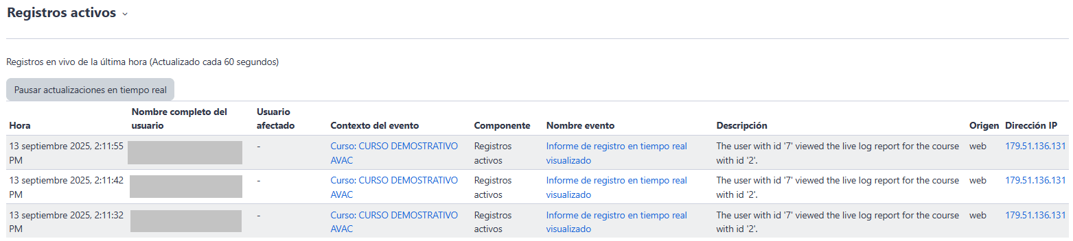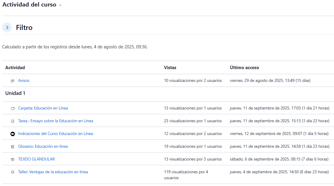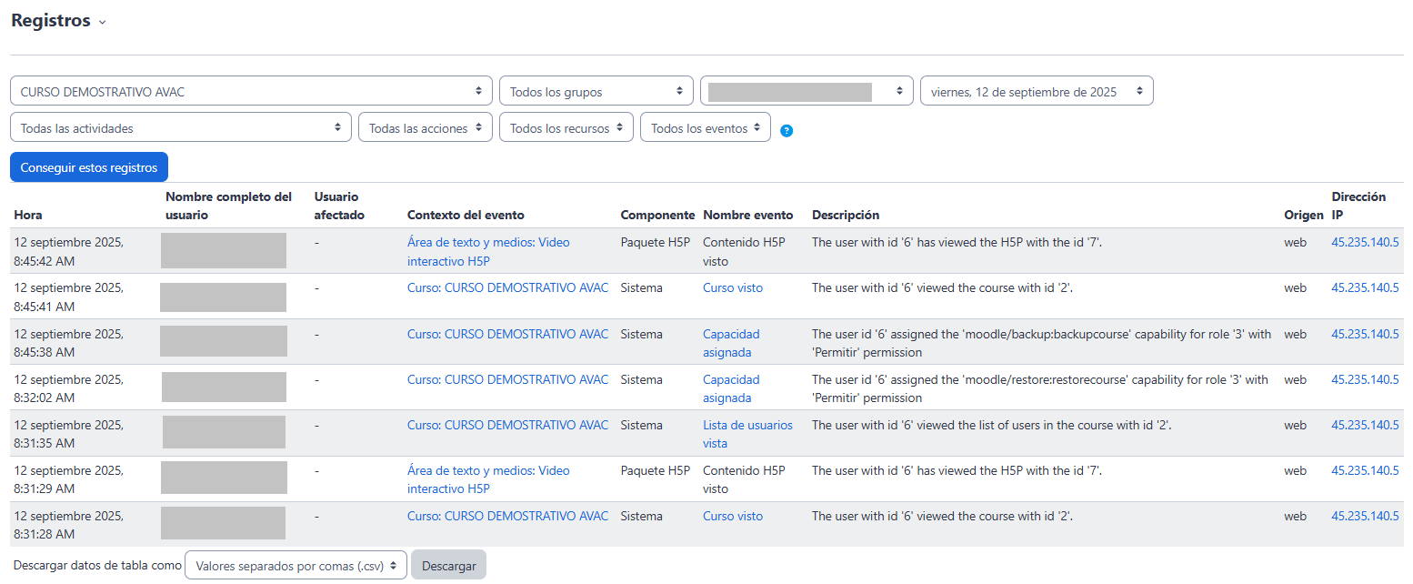 - Le permite consultar todas las acciones que los estudiantes y docentes realizan en el curso. Puede aplicar filtros por participante, fecha, actividad.