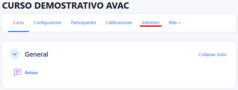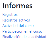 El menú Informes le permite acceder a información detallada sobre el progreso del curso, la participación de los estudiantes, sus actividades realizadas y el nivel de cumplimiento de los objetivos establecidos.