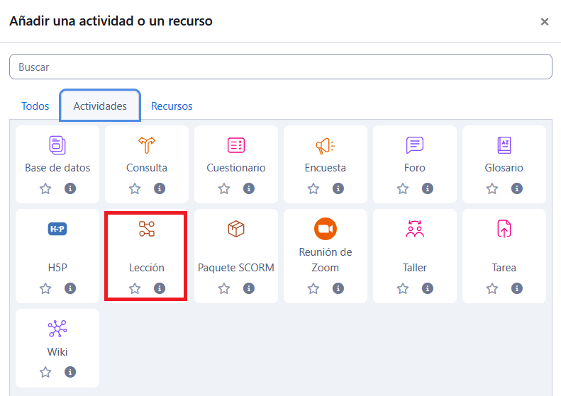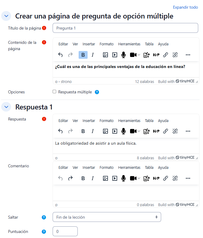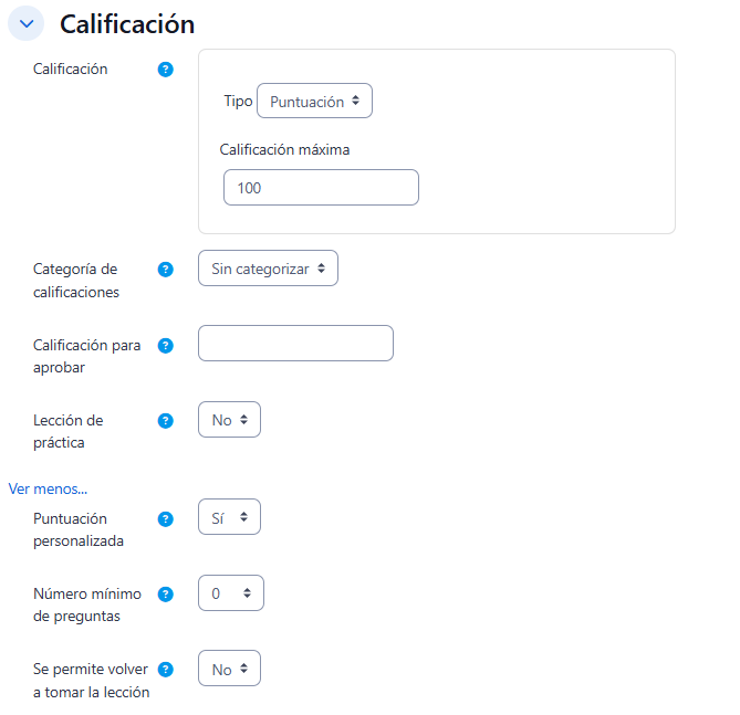 - "Puntuación": Es el número de puntos que suma esa opción o pregunta para la calificación final de la Lección.