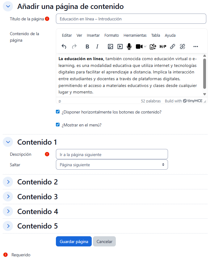- Rellenar uno o varios cuadros de "Contenido", donde cada uno añade un botón al final de la página con un salto asociado a otras páginas o preguntas de la Lección. Para crear se debe indicar: