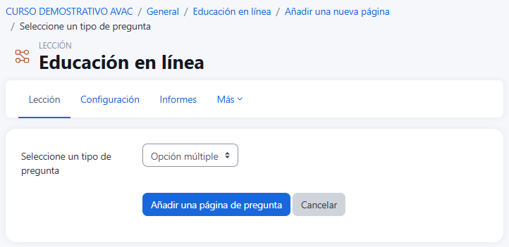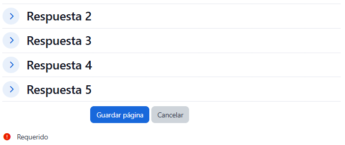 - "Añadir una página de pregunta": Crea una página que incluye contenido seguido de una pregunta de cualquier tipo disponible. Según la respuesta del estudiante (correcta o incorrecta), se le redirige a una página diferente. La navegación entre páginas se gestiona mediante los Saltos definidos en cada una de ellas.