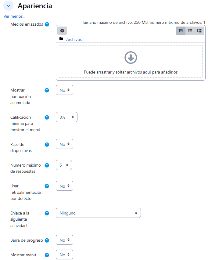 Medios enlazados: Permite adjuntar un archivo multimedia (audio, video, presentación, etc.) que se mostrará en una ventana emergente durante la lección.