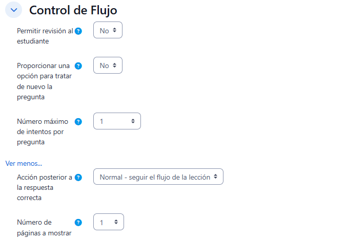 - "Número máximo de intentos por pregunta", de los que un alumno dispone para responder correctamente a una pregunta antes de que se muestre la siguiente página.