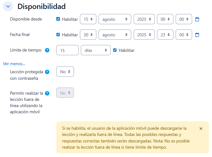 - "Disponible desde" y "Fecha final" , indica el periodo en el que la Lección está abierta.
