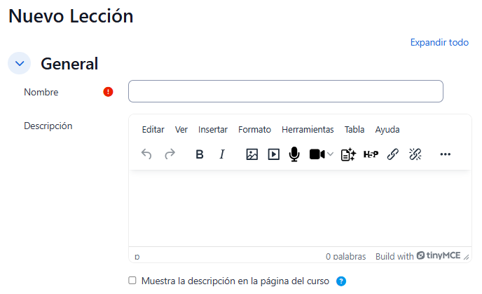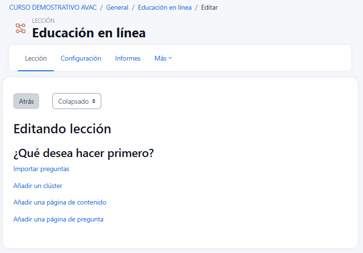La edición inicial y posterior se realiza desde el menú "Lección" , donde se presentan cuatro opciones: