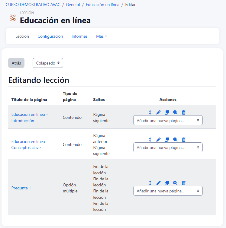 En el menú "Leción", al seleccionar "Colapsado" se visualizará en el orden de navegación por defecto. Es posible cambiar el orden o asociar un salto a cualquier respuesta pudiendo crear un itinerario más complicado.