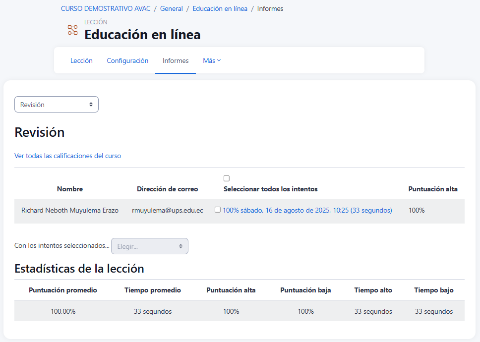 En "Informes", se accede a las calificaciones que han obtenido los estudiantes en cada intento realizado. Donde en "Revisión" visualizará las estadísticas generales de la Lección y en "Estadísticas de la lección" presenta la puntuación obtenida en la Lección.
