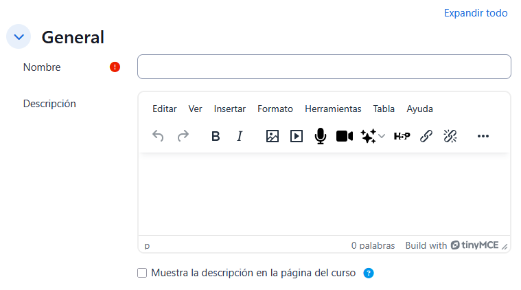 - Si lo desea, active la opción "Mostrar la descripción en la página del curso".