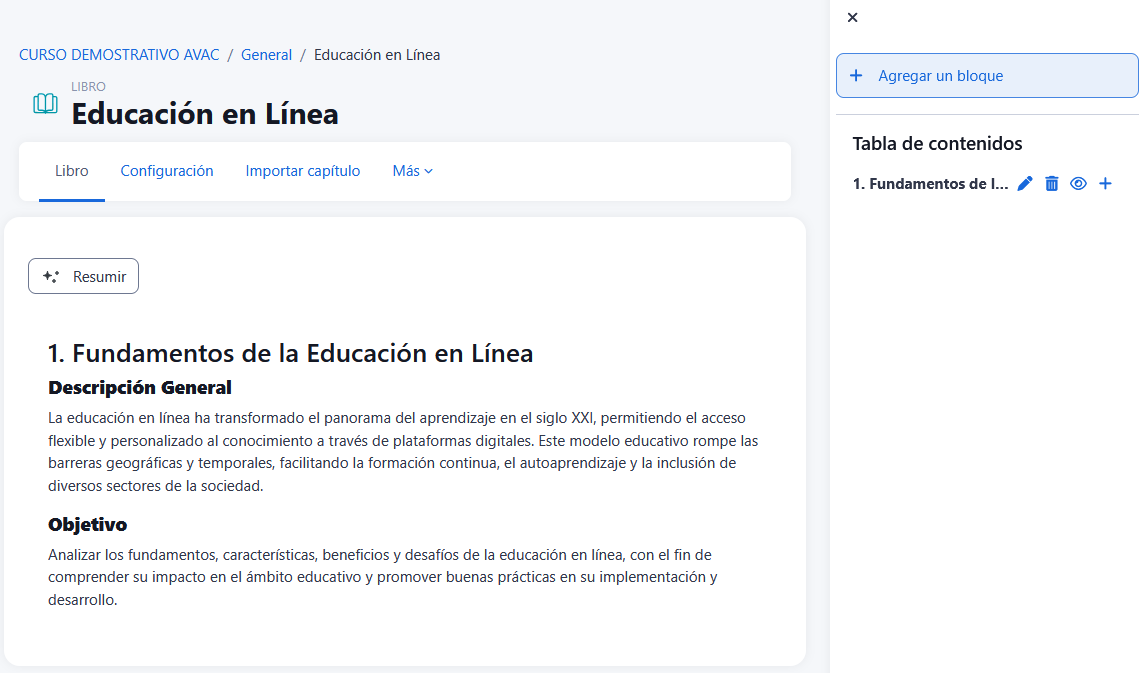 - Puede editar, mover o eliminar capítulos en cualquier momento desde las opciones de administración del Libro.