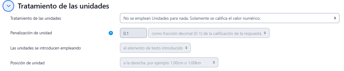 - En esta sección se decide si las unidades entran en la calificación de la pregunta en "Tratamiento de las unidades" y si se penaliza en caso de que sean incorrectas. Cuenta con 3 opciones: