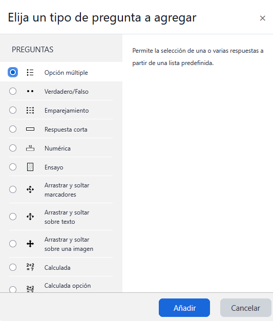 - Seleccionar la categoria y hacer clic en el botón "Crear una nueva pregunta", se mostrará una lista de tipos de preguntas.