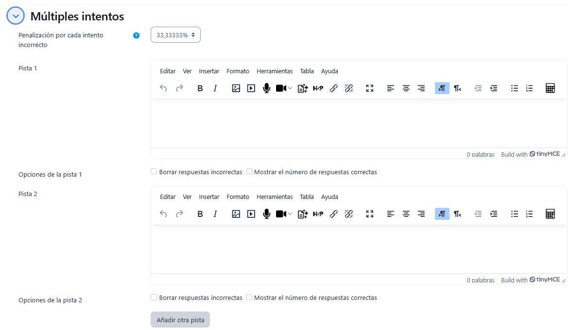 - "Penalización por cada intento incorrecto", es el valor proporcional a la calificación total de la pregunta aplicada por cada intento incorrecto.