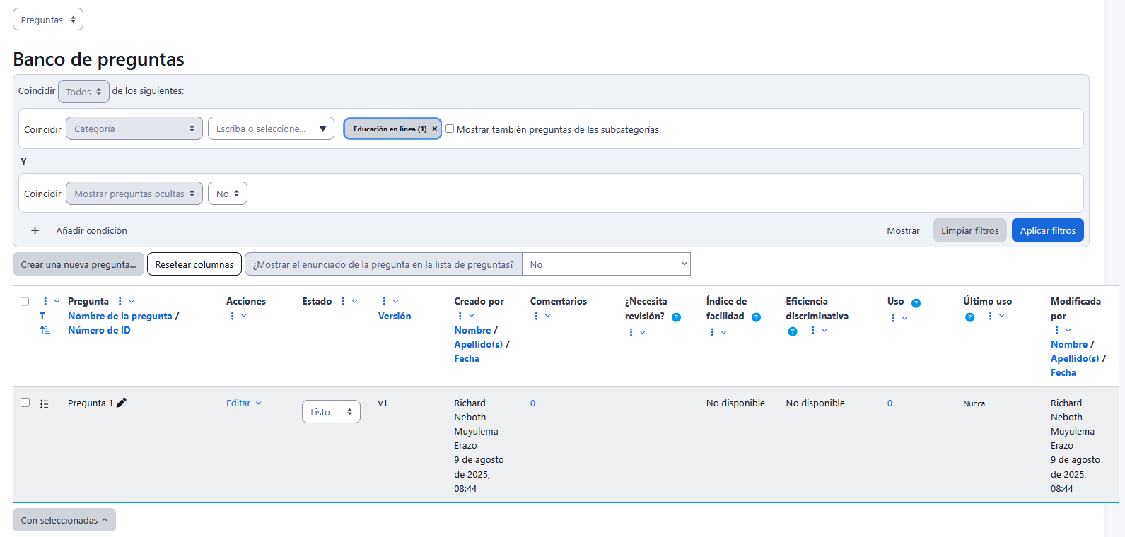 - "Estado de pregunta", indica si la pregunta está Lista para usarse o si está en Borrador.