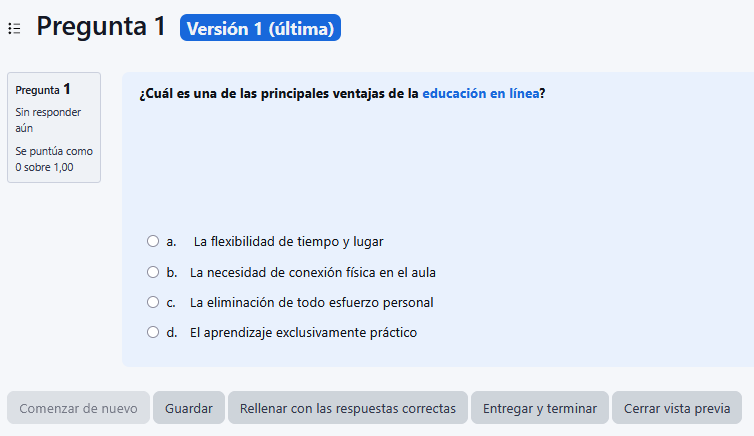 Nota: En las preguntas de opción múltiple con una sola respuesta correcta, es posible aplicar penalizaciones en el cuestionario asignando calificaciones negativas a las opciones incorrectas. Esto permite reducir la puntuación del estudiante cuando selecciona una respuesta errónea.