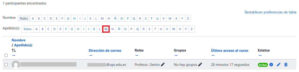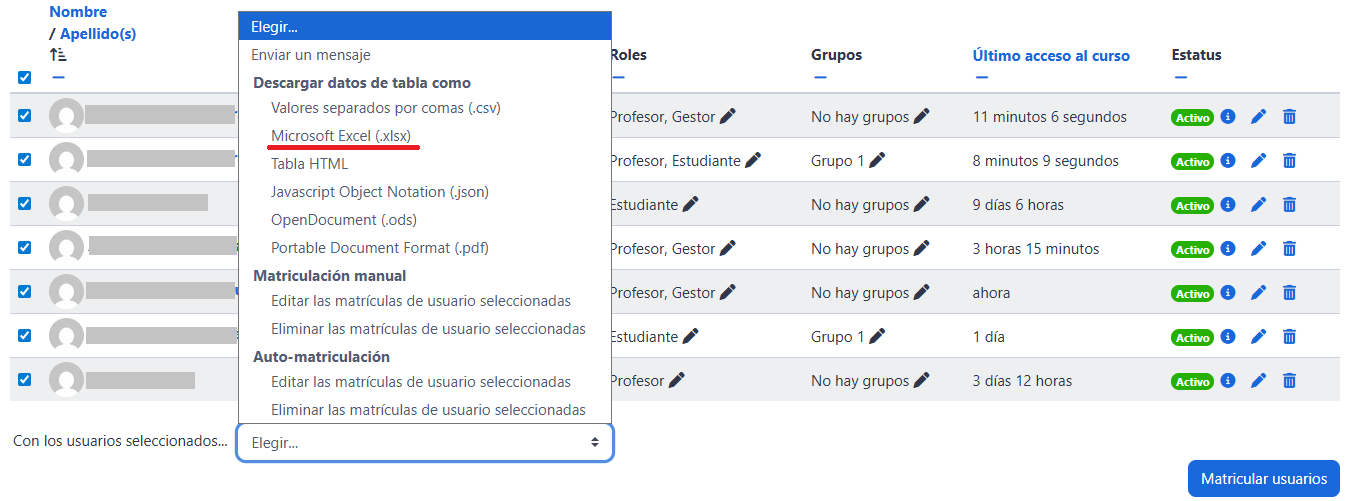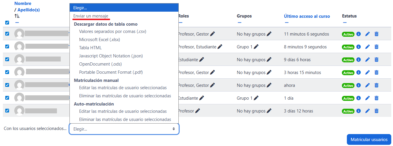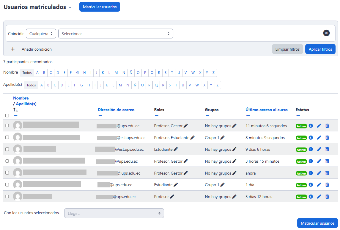- Se desplegará una tabla con la lista de usuarios matriculados en el curso.