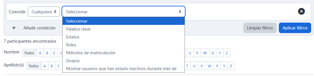 - En la parte superior de la tabla, utilice los filtros para buscar participantes por: