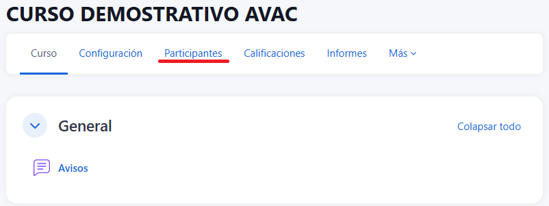 El menú Participantes le permite gestionar y visualizar la lista de estudiantes matriculados en el curso, así como realizar diversas acciones de administración y comunicación.