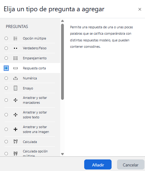 - Seleccionar "Respuesta corta" y luego hacer clic en el botón "Añadir"