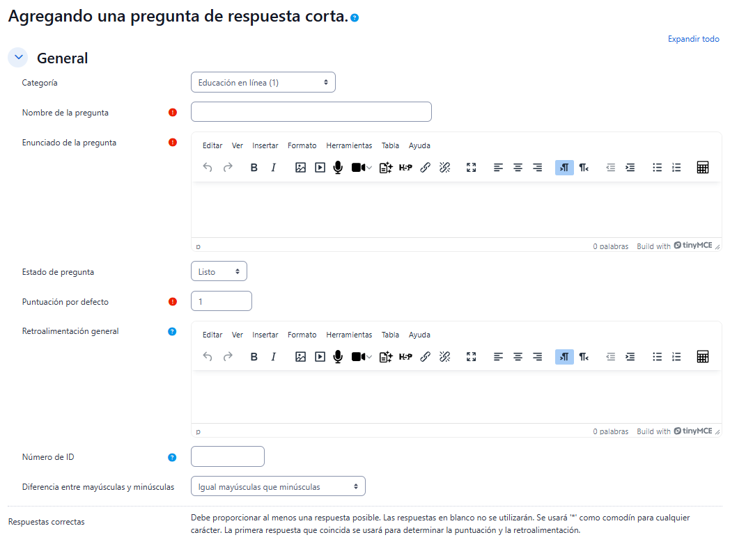 - "Diferencia entre mayúsculas y minúsculas", seleccionar si se desea distinguir entre mayúsculas y minúsculas al comparar la respuesta del estudiante con las respuestas aceptadas.