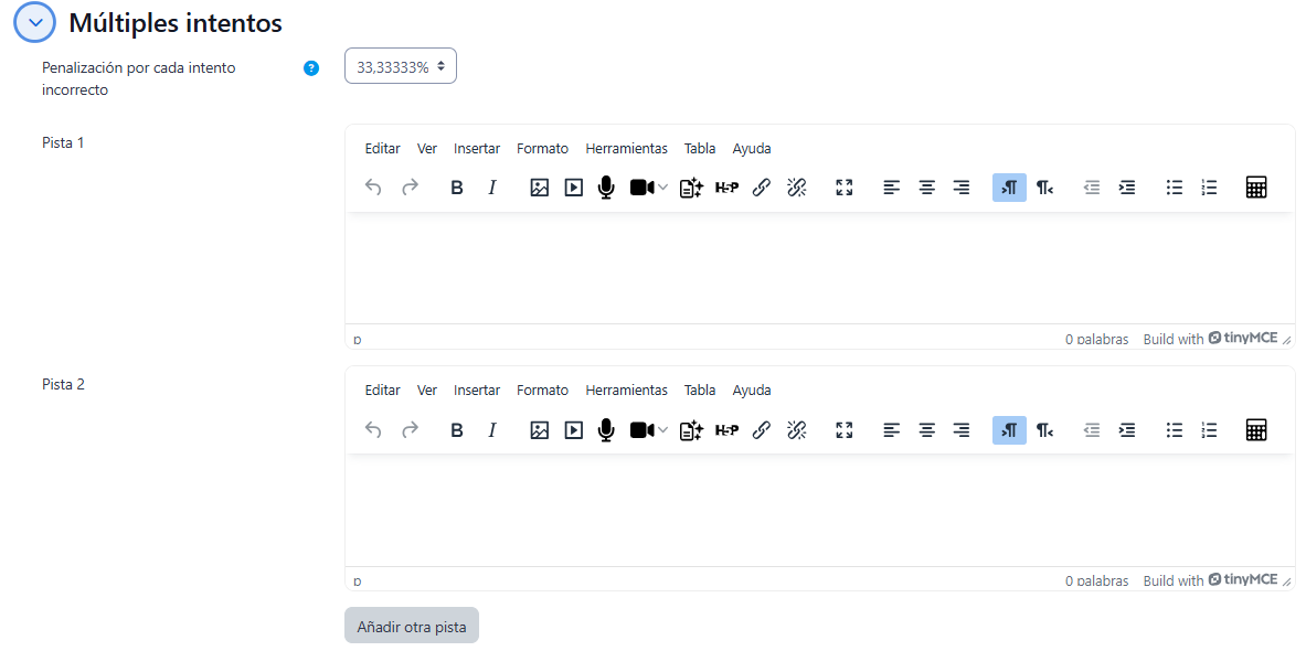 - " Múltiples intentos", permite que el estudiante realice varios intentos para responder una pregunta, definiendo el valor de la penalización que se aplicará por cada intento incorrecto. Se pueden incluir Pistas en la pregunta, que se mostrarán al alumno cada vez que responda, pero solo si el cuestionario está configurado en el modo Múltiples intentos.